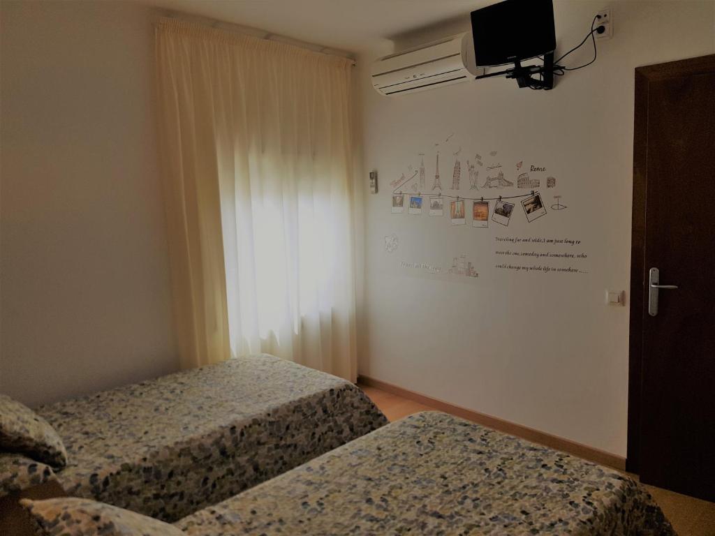 Habitación con aire acondicionado, TV y baño privado con bañera o ducha.